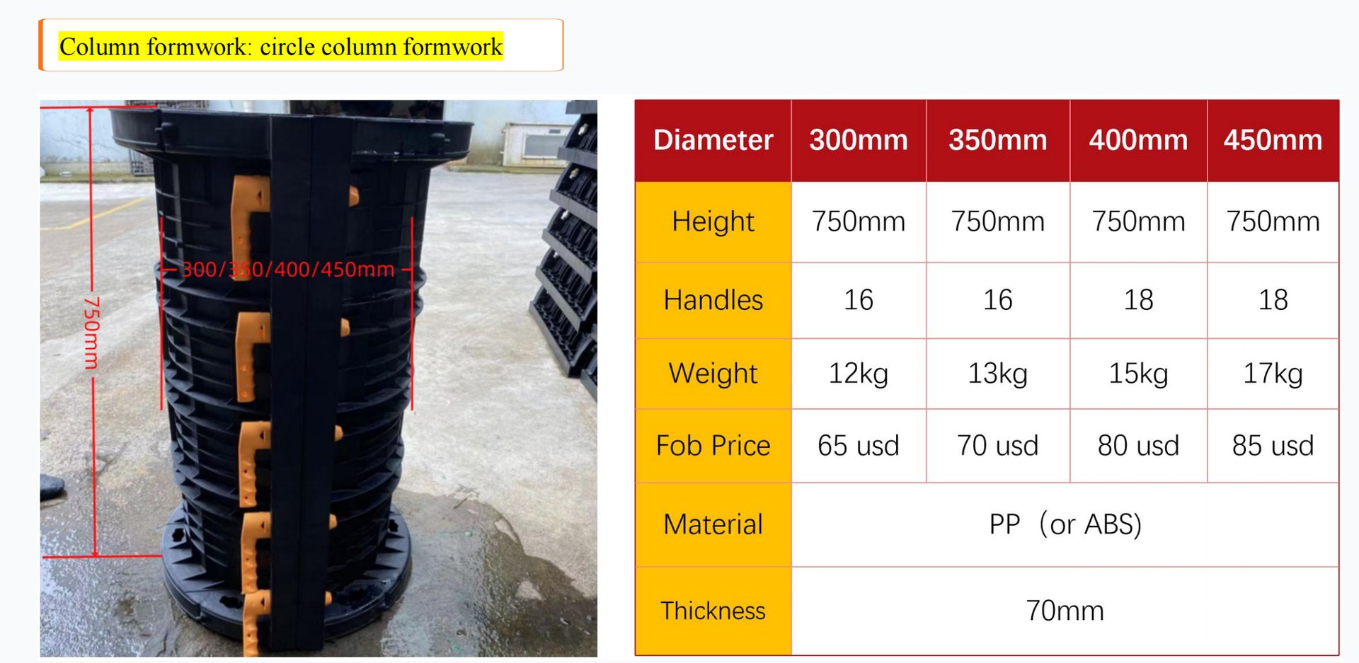 First, define core variables: unit price of formwork (USD/set), effective area per set (m²), total project column area (m²), reuse cycle (times), and maintenance cost per cycle (USD/m²). Typical circular plastic formwork specifications for circular columns range from Φ300mm to Φ450mm, with a standard panel height 750mm
